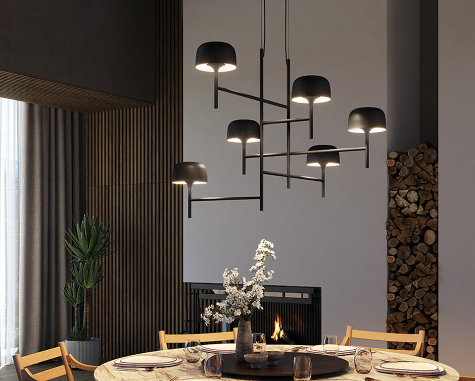 Inspiriert von klassischen Maria-Theresia-Kronleuchtern vereint die Bover Bol von Estudi Manel Molina (2022) skulpturales Design mit direktem und indirektem Licht. Das modulare System aus Aluminium, Messing und Polycarbonat ermöglicht vielfältige Konfigurationen. Erhältlich in sieben texturierten Farben.