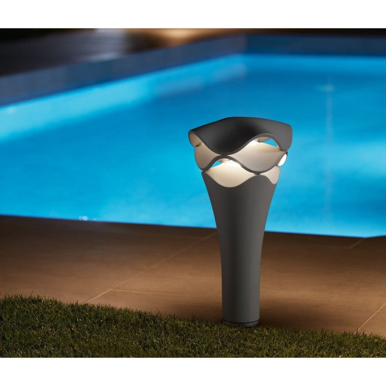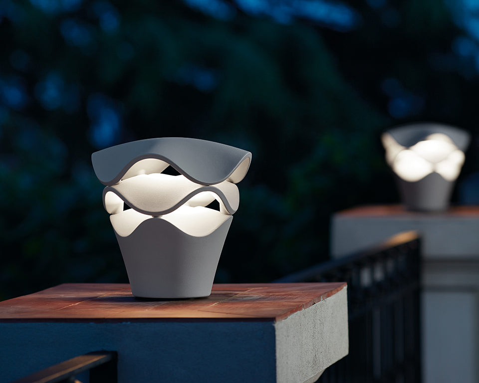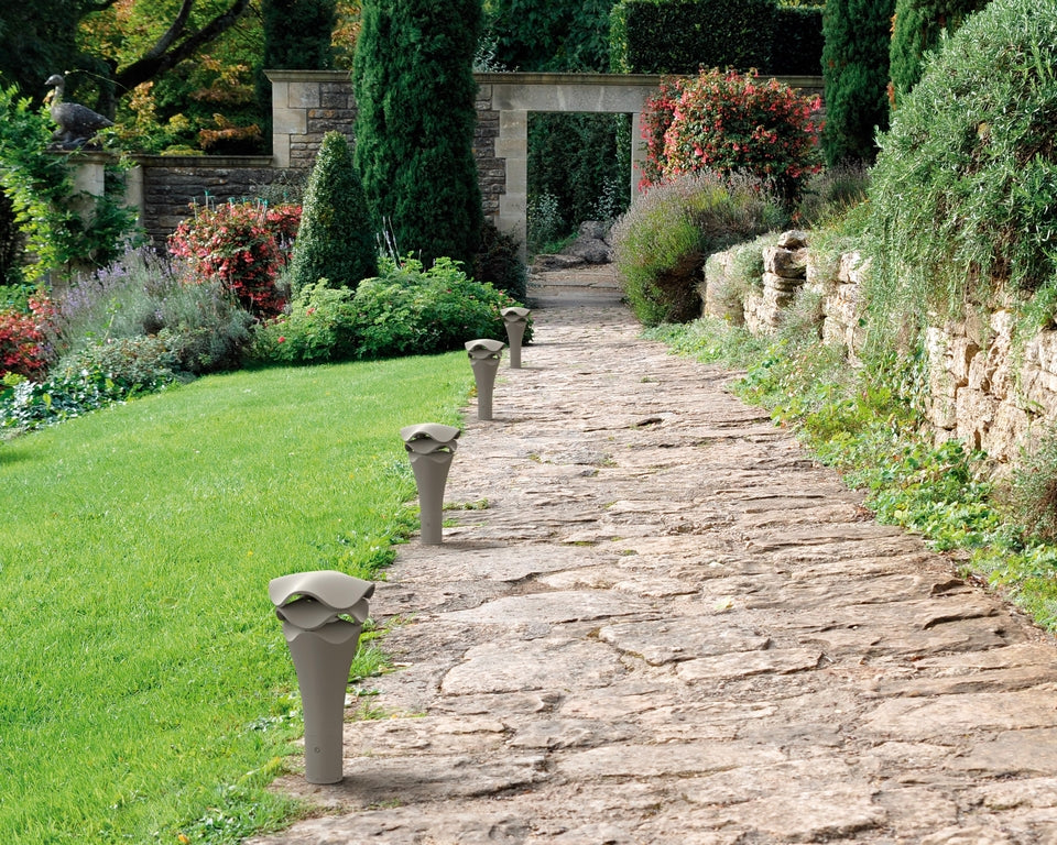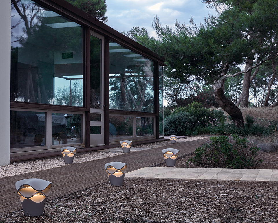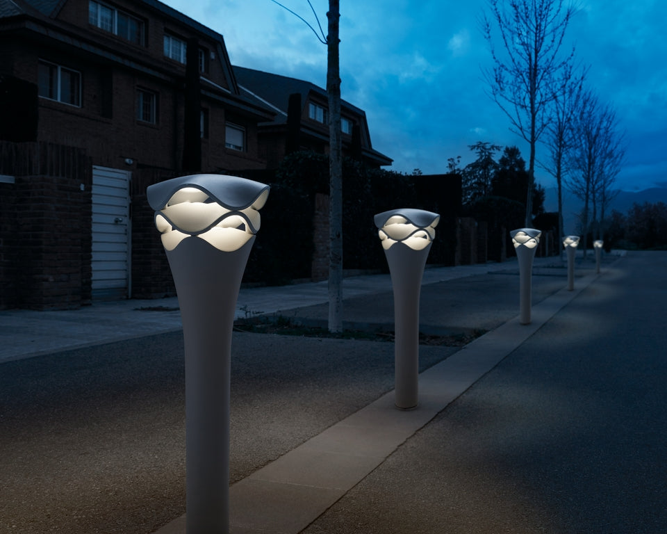 Die Einsatzmöglichkeiten der Cornet sind äußerst vielseitig. Sie kann sowohl als Pollerleuchte für direktes Licht dienen als auch für eine großflächigere Beleuchtung größerer Areale eingesetzt werden. Die Cornet verfügt über eine dimmbare LED-Lichtquelle, die das Licht durch die wellenförmigen Schichten der Leuchte verteilt. Dadurch entsteht eine natürliche, sanft gebrochene Atmosphäre, die präsent, aber niemals aufdringlich wirkt.
