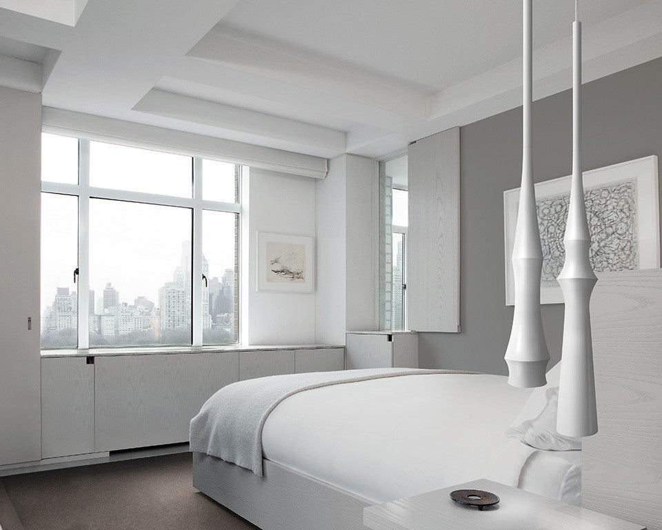 Die Bover Slend Pendelleuchte von Christophe Mathieu (2014) besticht durch ihre schmale, elegante Silhouette. Handgefertigter Textilschirm in sieben Farben. Drei Größen – einzeln oder als Gruppe eindrucksvoll.