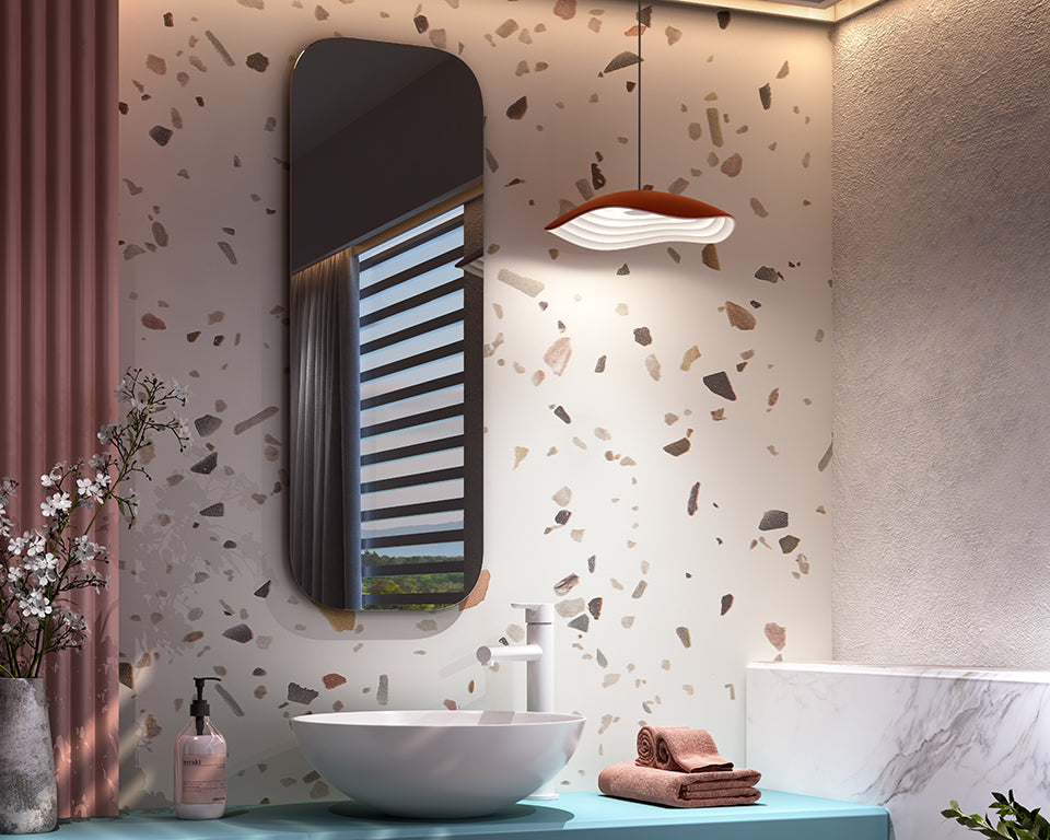 Die Bover Valentina von Alex Fernández Camps (2020) – eine zarte Pendelleuchte und Nachttischleuchte mit raffiniertem Doppelschirm. Version S/24 in Aufputz- oder Unterputzmontage. Vier elegante Farbkombinationen.